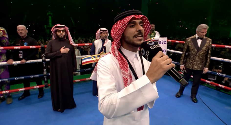 Un chanteur interprète l’hymne national saoudien en présence de Turki Al-Sheikh (au 2d plan à gauche), lors du combat de boxe anglaise à Riyad entre Oleksandr Usyk et Tyson Fury, le 21 décembre 2024, pour le titre mondial de champion incontesté des poids lourds. Image tirée de la vidéo de Ring Magazine sur Youtube, le 12/01/2025.