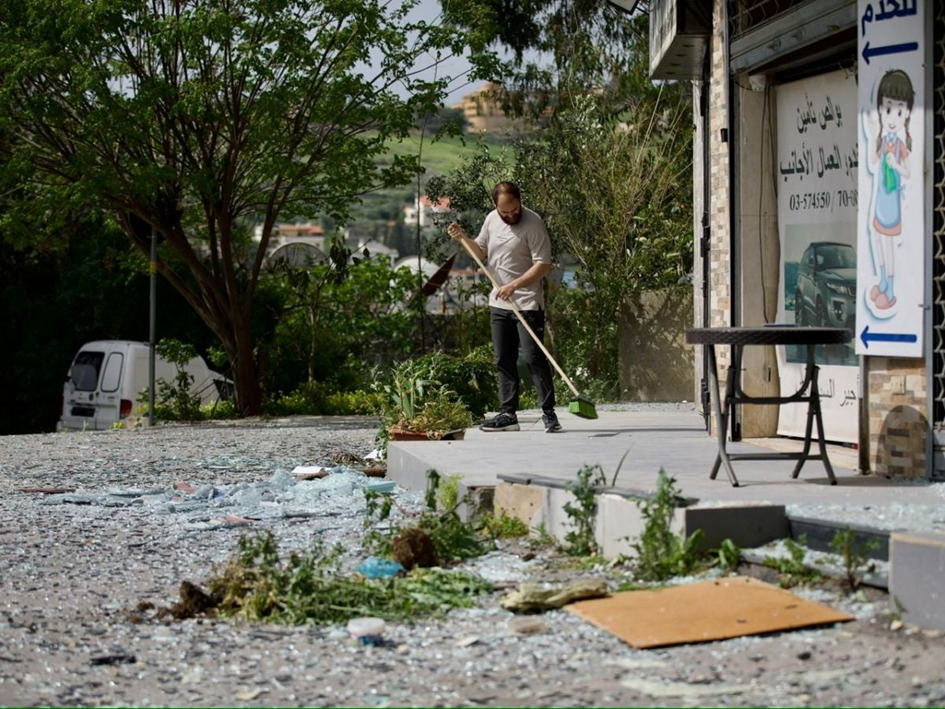Un homme balayant le parvis d’un immeuble à Nabatiyé, au Liban-Sud, l’une des zones les plus bombardées par Israël, le 17 avril 2026. © Matthieu Karam / L’Orient-Le Jour