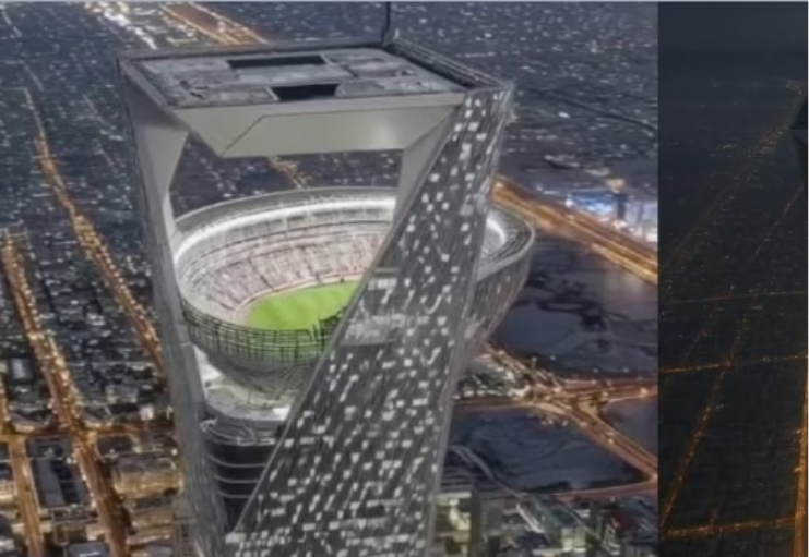 L’NEOM Stadium en Arabie saoudite est un projet de stade futuriste d’environ 46 000 places, suspendu à 350 mètres d’altitude, intégré à la mégapole linéaire The Line dans le désert, et prévu pour accueillir des matches de la Coupe du Monde de la FIFA 2034 (Voir l’article d’Oumma).